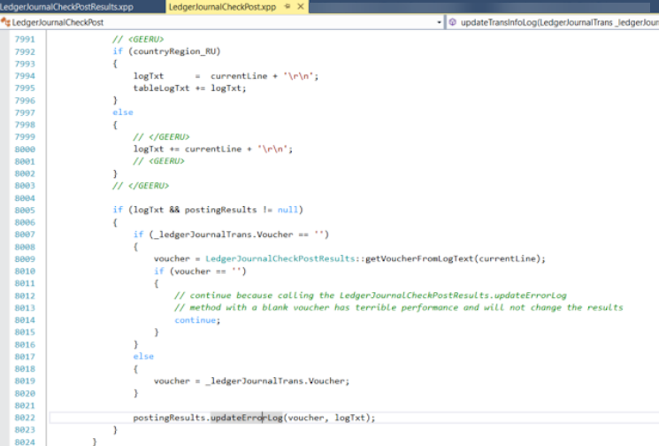 /// <summary> /// Extension of LedgerJournalCheckPost to fix a bug /// </summary> [ExtensionOf(classStr(LedgerJournalCheckPost))] final class LedgerJournalCheckPost_Extension { /// <summary> /// Updates the infolog for the given transaction. /// </summary> /// <param name = "_ledgerJournalTrans">The transaction.</param> public void updateTransInfoLog(LedgerJournalTrans _ledgerJournalTrans) { this.myUpdateTransInfoLog(_ledgerJournalTrans); // transLogPoint is already moved forward; therefore the next call will do no change to the log next updateTransInfoLog(_ledgerJournalTrans); } /// <summary> /// Updates the infolog for the given transaction. /// </summary> /// <param name = "_ledgerJournalTrans">The transaction.</param> private void myUpdateTransInfoLog(LedgerJournalTrans _ledgerJournalTrans) { #Define.UserTab('\t') Log logTxt; Integer x = transLogPoint; Integer y = infolog.num(0); str currentLine; str strLine; Voucher voucher; List list; ListEnumerator listEnumerator; Set setAllLines = new Set(Types::String); // <GEERU> Log tableLogTxt; #ISOCountryRegionCodes boolean countryRegion_RU = SysCountryRegionCode::isLegalEntityInCountryRegion([#isoRU]); // </GEERU> if (postingResults) { postingResults.parmLedgerPostingMessageLog(ledgerPostingMessageCollection); } while (x < y) { x++; // parse all the lines if there are some prefixes currentLine = infolog.text(x); list = strSplit(currentLine, #UserTab); listEnumerator = list.getEnumerator(); while (listEnumerator.moveNext()) { currentLine = listEnumerator.current(); if(setAllLines.in(currentLine)) { continue; } setAllLines.add(currentLine); // <GEERU> if (countryRegion_RU) { logTxt = currentLine + '\r\n'; tableLogTxt += logTxt; } else { // </GEERU> logTxt += currentLine + '\r\n'; // <GEERU> } // </GEERU> if (logTxt && postingResults != null) { if (_ledgerJournalTrans.Voucher == '') { voucher = LedgerJournalCheckPostResults::getVoucherFromLogText(currentLine); if (voucher == '') { // continue because calling the LedgerJournalCheckPostResults.updateErrorLog // method with a blank voucher has terrible performance and will not change the results continue; } } else { voucher = _ledgerJournalTrans.Voucher; } postingResults.updateErrorLog(voucher, logTxt); } } } // <GEERU> if (countryRegion_RU) { logTxt = tableLogTxt; } // </GEERU> if (logTxt) { tableErrorLog += logTxt; } transLogPoint = y; } }